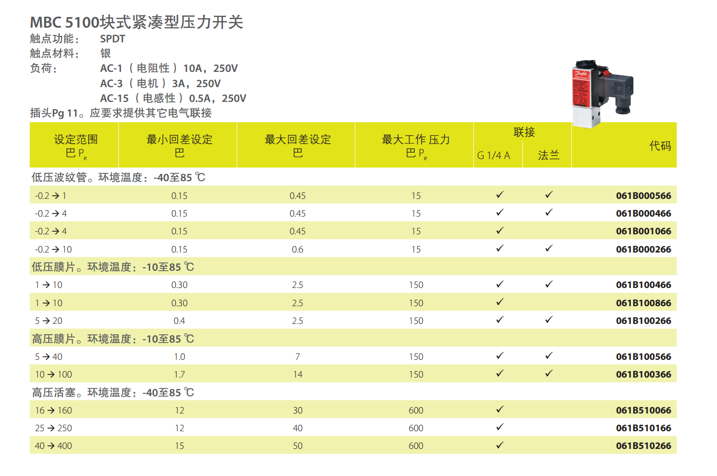 ? 壓力范圍:-0.2至400巴 ? 小回差(固定式)微動(dòng)開(kāi)關(guān)