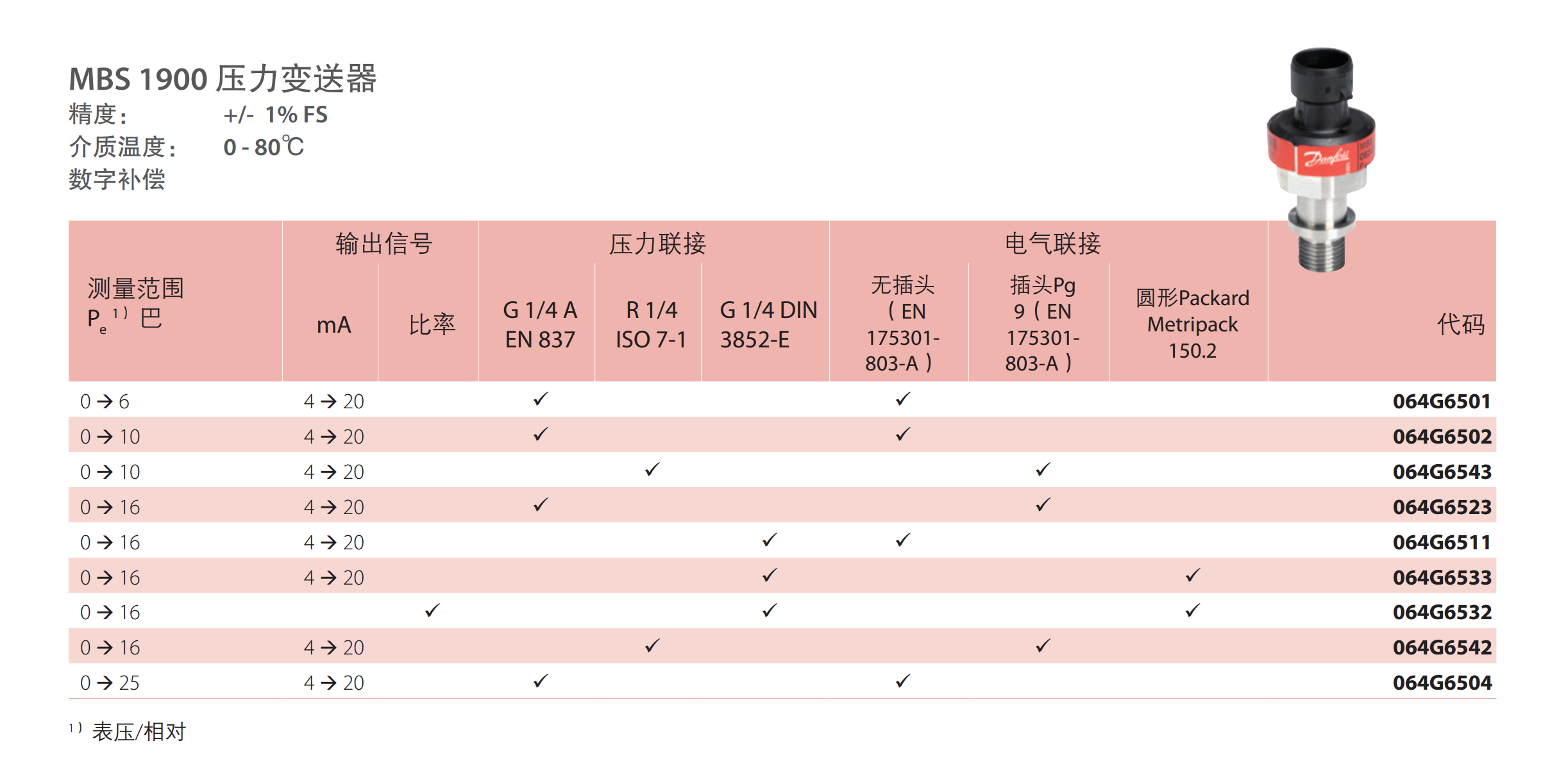 MBS 1900型壓力變送器適用于空氣與水應用,如加壓泵與空氣壓縮機等。